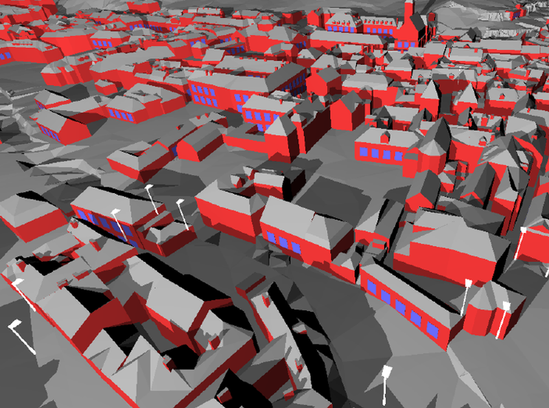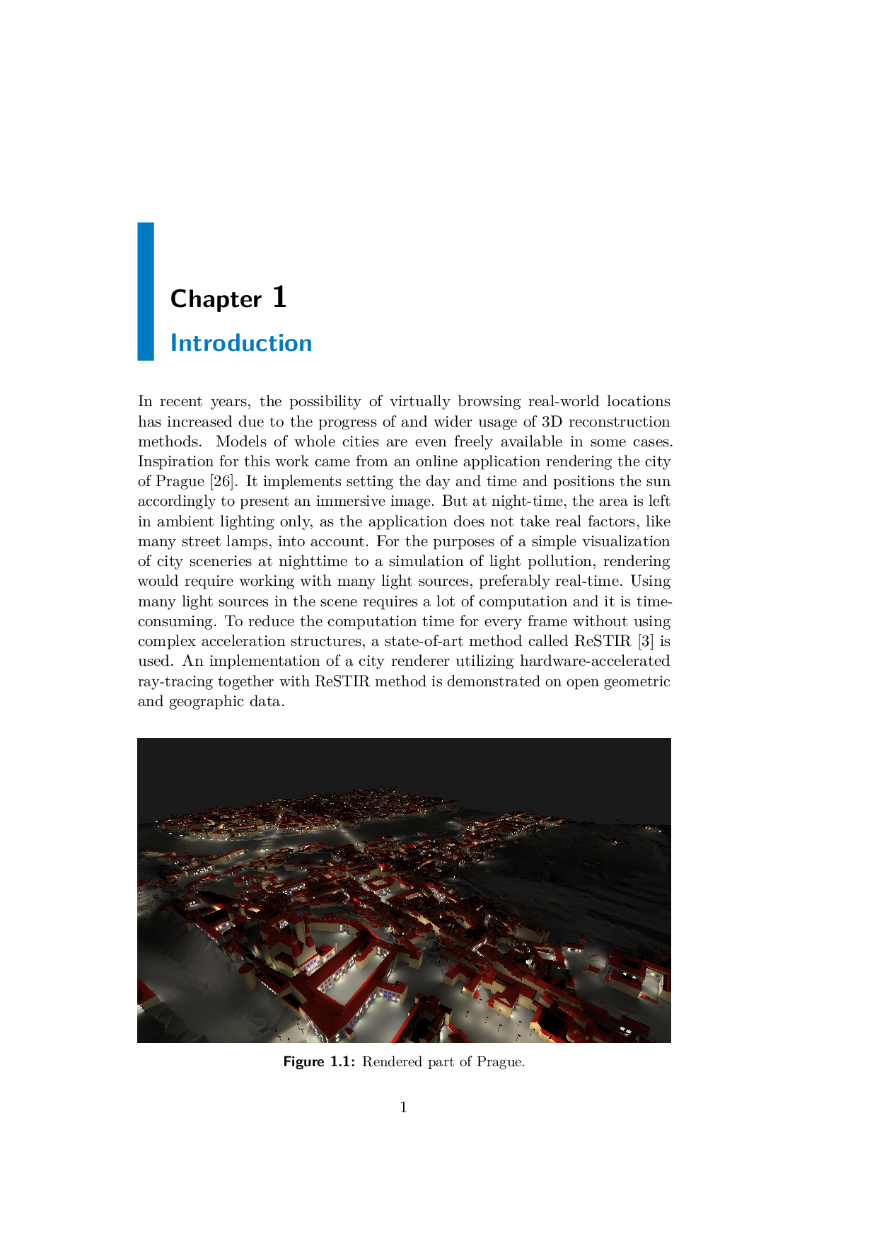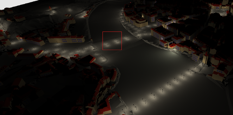 In recent years, the possibility of virtually browsing real-world locations has increased due to the progress of and wider usage of 3D reconstruction methods. Models of whole cities are even freely available in some cases. For the purposes of a simple visualization of city sceneries at nighttime to a simulation of light pollution, rendering would require to work with many light sources, all at realtime. This work focuses mapping out the methods to render direct illumination of night scenes with many light sources efficiently, implements suitable one using Vulkan API with hardware raytracing support and showcases results on test scenes built from open data of city models.