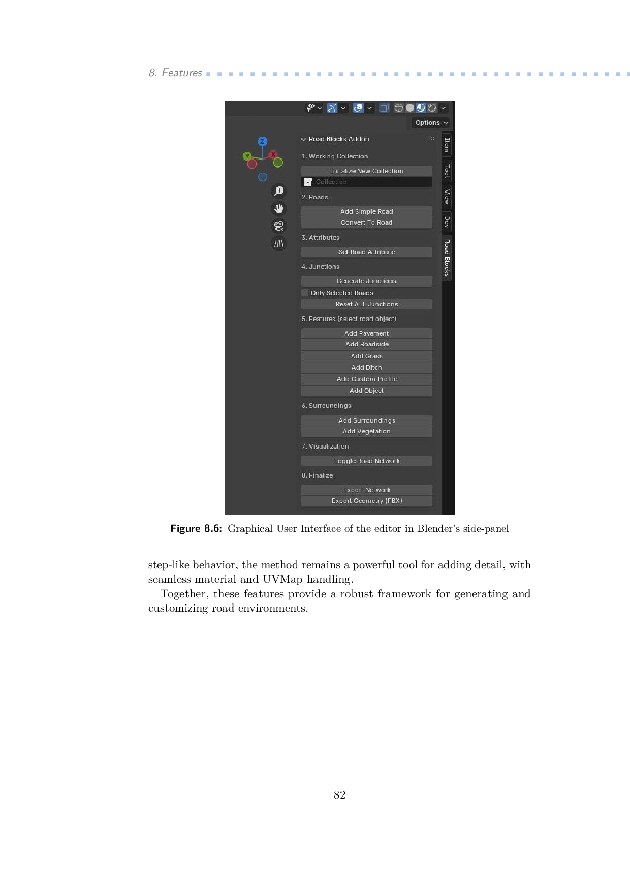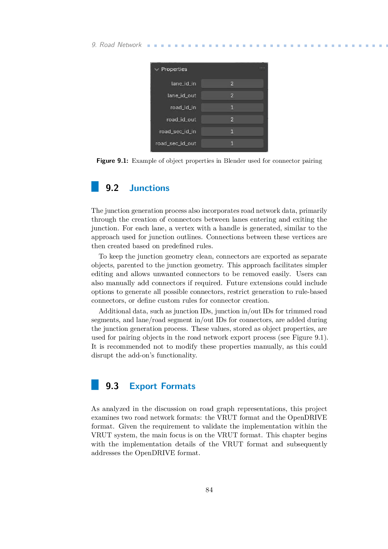 This thesis addresses the need for an interactive tool to create and edit road network blocks for virtual environments, particularly within the Virtual Reality Universal Toolkit (VRUT). The developed editor supports the design of straight sections, curves, and junctions using a skeleton-based representation, where nodes represent lane centers and edges of their connections. Procedural generation techniques enable the creation of detailed road surfaces, lane markings, and roadside features, such as vegetation and drainage. The editor, implemented in Blender, employs geometry nodes for efficient modeling and customization. Junction modeling is a focal point featuring an algorithm for generating smooth geometries and customizable connections. Export functionality ensures compatibility with the VRUT system via its custom XML-based format. The editor's utility was validated by creating ten road scenarios tested within VRUT's simulation environment, demonstrating robust integration and versatility. This work contributes a flexible tool for road network modeling, advancing VRUT's capabilities in virtual environment design and traffic simulation.