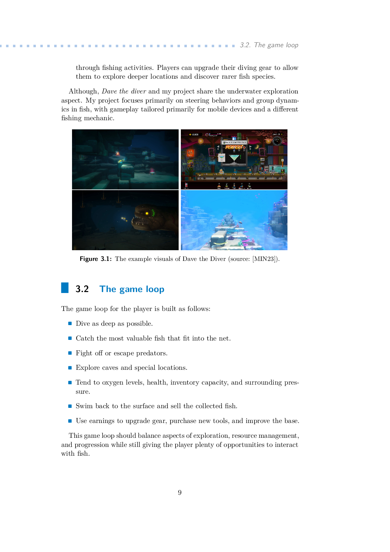 Nehráčské postavy (NPC) jsou důležité pro vytvoření pohlcujícího herního zážitku tím, že simulují svět, který je neustále živý i když hráč zrovná není aktivní. Dosažení tohoto cíle často zahrnuje implementaci umělé inteligence, která je pro hráče výzvou a projevuje přirozené a realistické chování. Tento projekt se zabývá vývojem takového chování prostřednictvím implementace tzv. textit{steering behaviors} a tzv. textit{flocking} algoritmu. Tyto techniky jsou navrženy tak, aby zajistily přirozenou interakci NPC s prostředím a hráčem. Výsledkem je prototyp 2D hry s potápěním a chytáním ryb, kde tato chování tvoří základní herní mechaniky a demonstrují svůj potenciál pro zlepšení herní dynamiky a realističnosti.